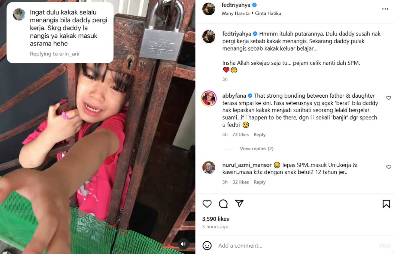 “Dulu daddy susah nak pergi kerja sebab kakak menangis. Sekarang daddy pula menangis sebab kakak keluar belajar… Insha-Allah, sekejap saja tu—pejam celik SPM.”