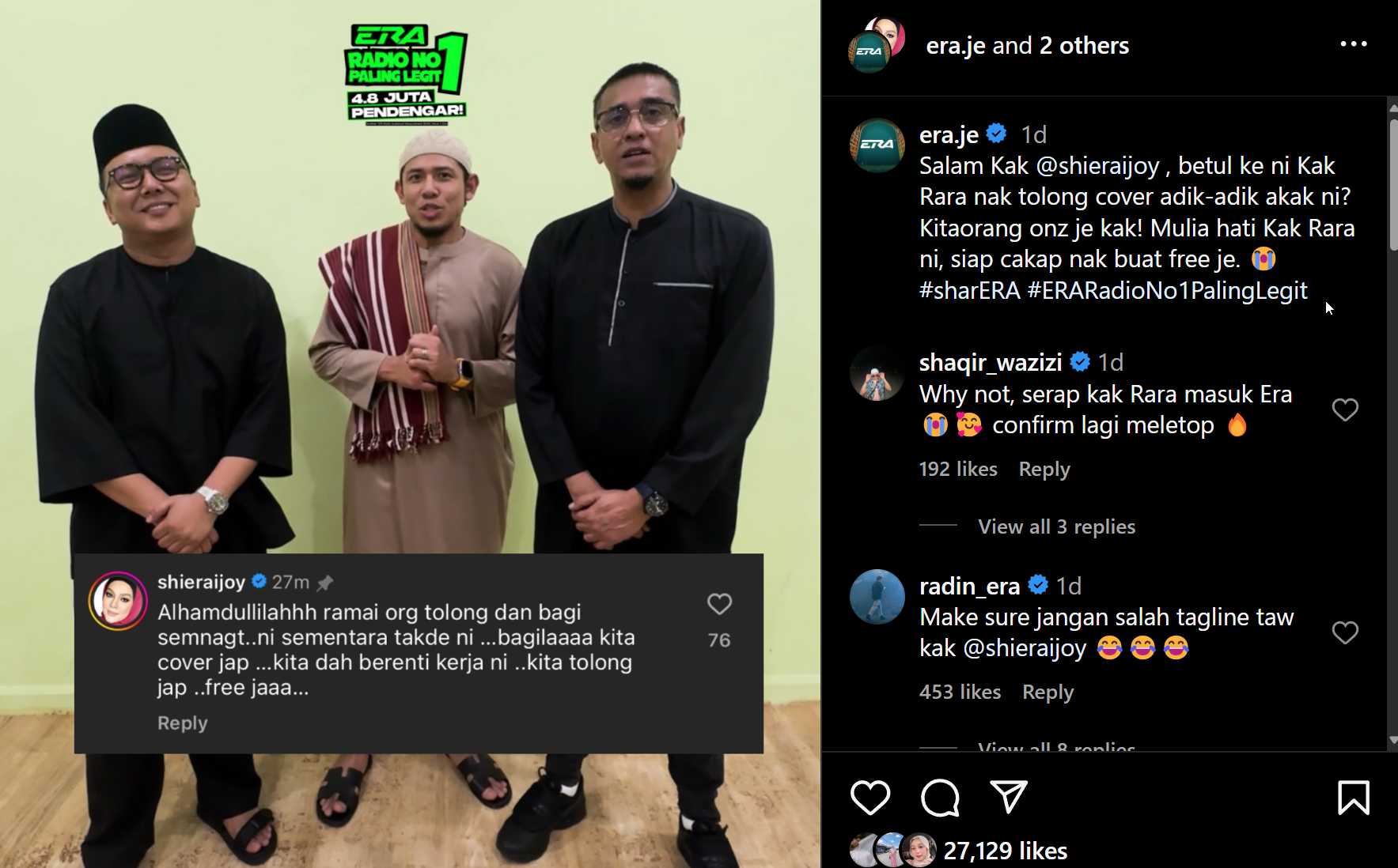 Komen tersebut ternyata menarik perhatian Era FM sehingga mereka sendiri memuat naik kembali kenyataan Shiera dengan bertanyakan sama ada dia benar-benar mahu mengendalikan segmen pagi mereka secara percuma.