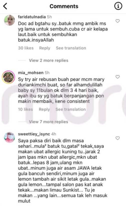 “Doktor ada bagitahu saya… Batuk memang ambik masa yang lama nak untuk sembuh. Cuba cari air kelapa laut. Baik untuk sembuhkan batuk InsyaAllah.”