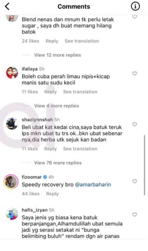 Perkongsian Amyra dihujani dengan komen peminat dan rakan selebriti seperti Fizo Omar dan Fendy Bakry yang menitipkan doa agar diberikan kesembuhan, malah ramai yang turut berkongsi petua yang boleh diamalkan oleh keluarga selebriti ini.