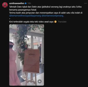 Kemunculan Datuk Aznil Nawawi atau lebih mesra disapa Pak Nil dalam sebuah majlis yang tular di media sosial benar-benar mencetuskan perbualan hangat apabila ramai menyangka ada sesuatu yang besar berlaku di belakang tabir. Dalam hantaran Instagram yang dikongsikan, beliau dilihat mengucapkan tahniah kepada “Dato Iqbal dan Datin” atas ijbakabul seorang lagi anaknya, Sofea bersama pasangannya, sambil menyatakan terima kasih atas jemputan dan suasana majlis yang indah di sebuah vila mewah di Penang.