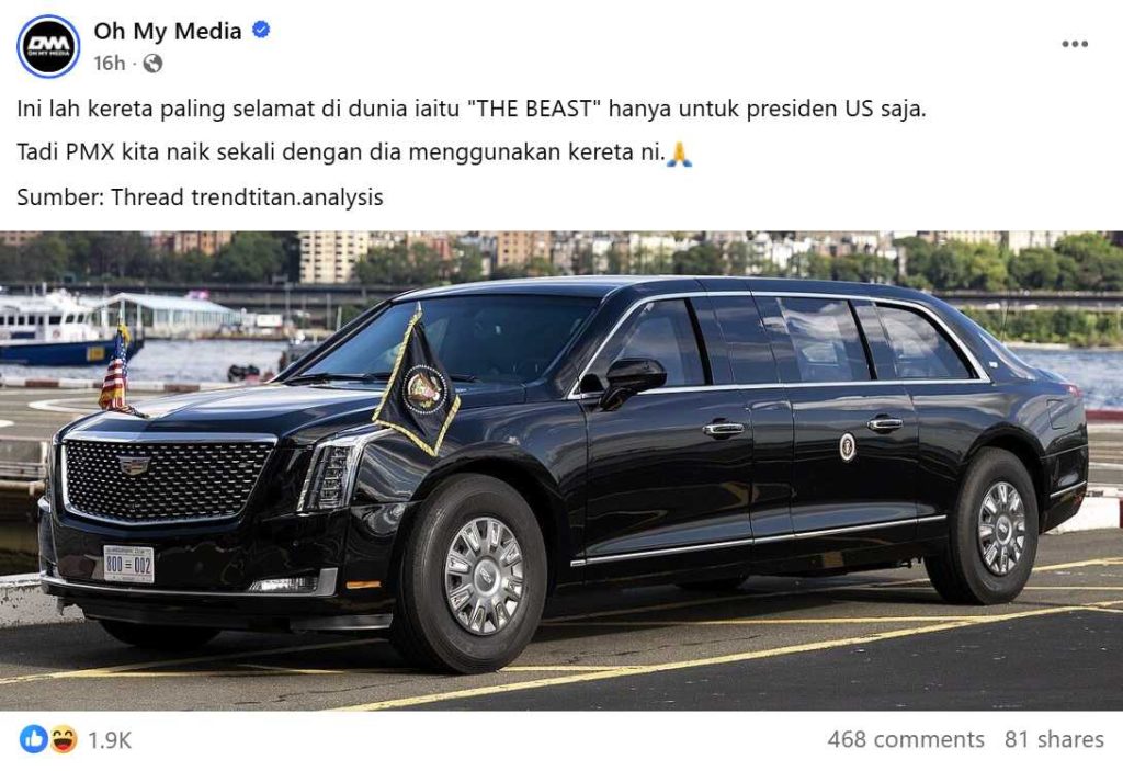 Kereta “The Beast” bukan sekadar pengangkutan, tetapi perlambangan status dan keselamatan tertinggi, melindungi Presiden AS dari ancaman ekstrem. Limousine ini direka dengan ciri-ciri kalis peluru, keluli bertetulang, sistem sokongan komunikasi dan perubatan kritikal. Hanya segelintir VIP dunia berpeluang berada di dalamnya — kali ini PM Anwar Ibrahim turut diberi penghormatan.