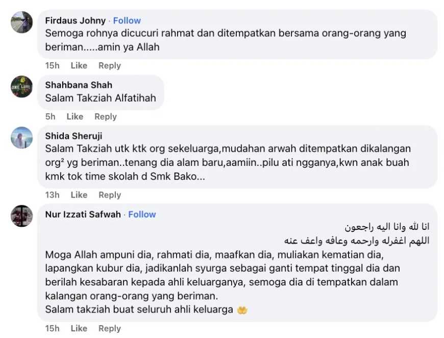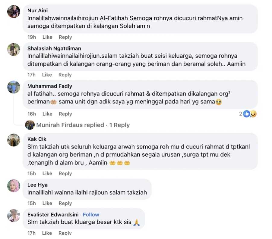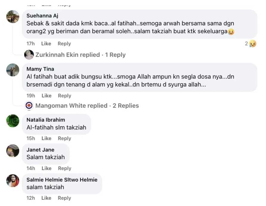 Rata-rata mereka mendoakan agar allahyarham ditempatkan dalam kalangan orang-orang yang beriman serta ahli keluarga yang ditinggalkan kuat menerima ujian daripada Allah S.W.T.
