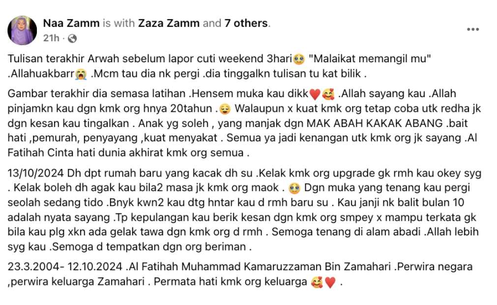 Kakak kongsi khabar duka. Menerusi perkongsian kakak kepada anggota tentera tersebut yang dikenali sebagai Naa Zamm, dia menyatakan allahyarham adiknya, Muhammad Kamaruzzaman Bin Zamahari telah meninggal dunia beberapa hari lepas bersama dua lagi rakannya.