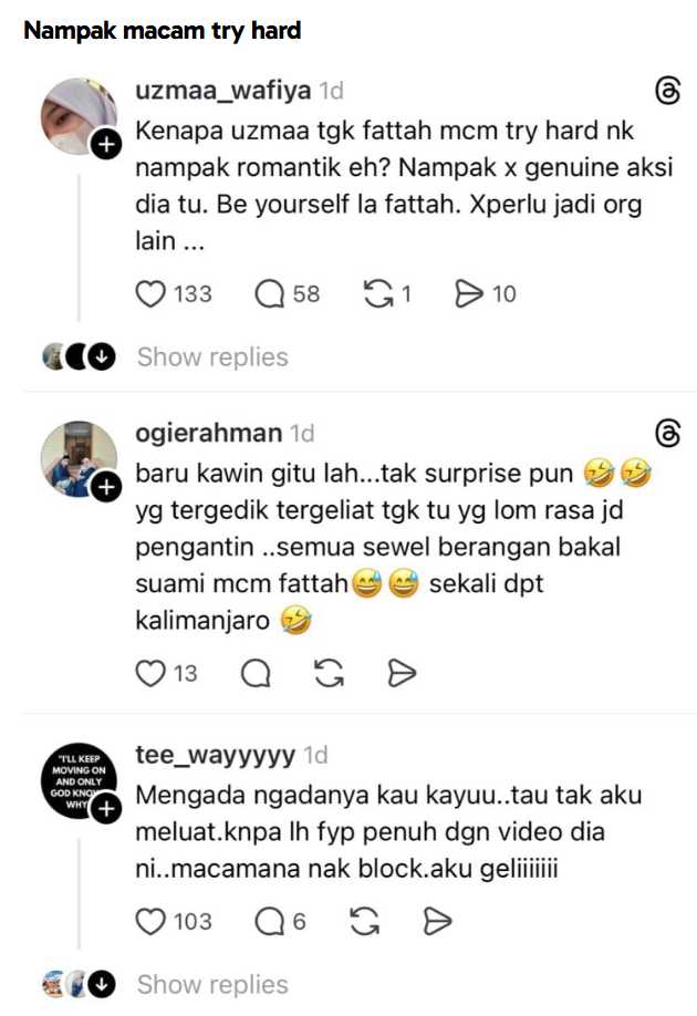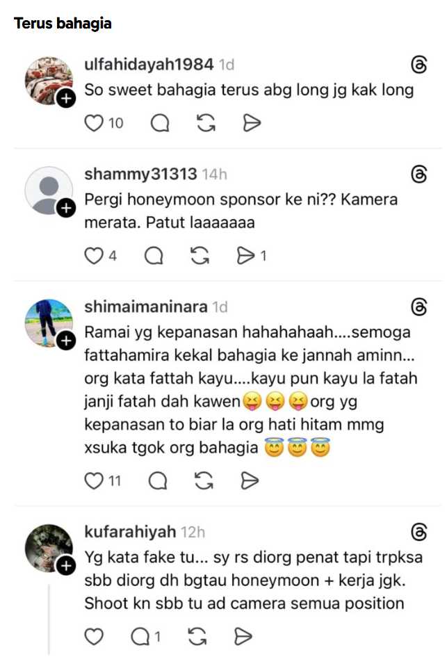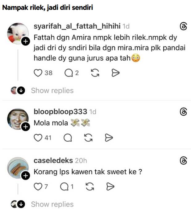 Ada yang memuji pasangan ini nampak tenang dan menjadi diri sendiri, manakala segelintir netizen menyatakan aksi Fattah Amin bermesra dengan Amira kelihatan seperti ‘try hard’ konon nak nampak romantik di hadapan kamera.