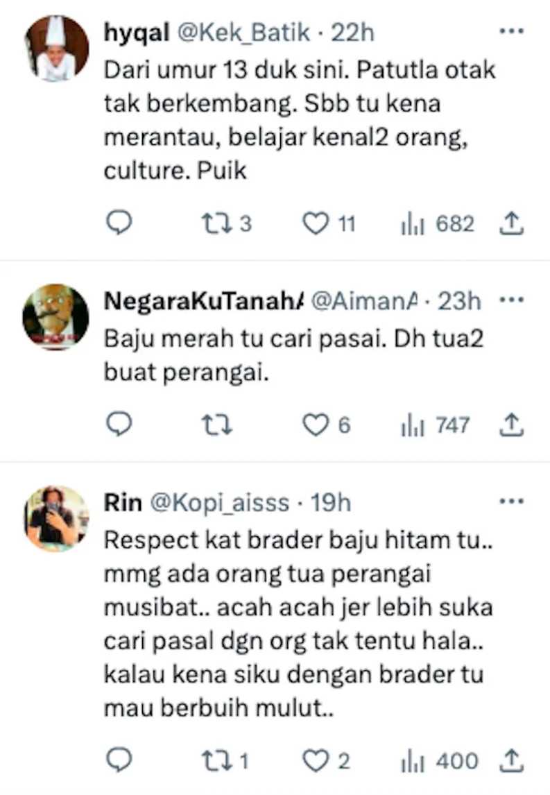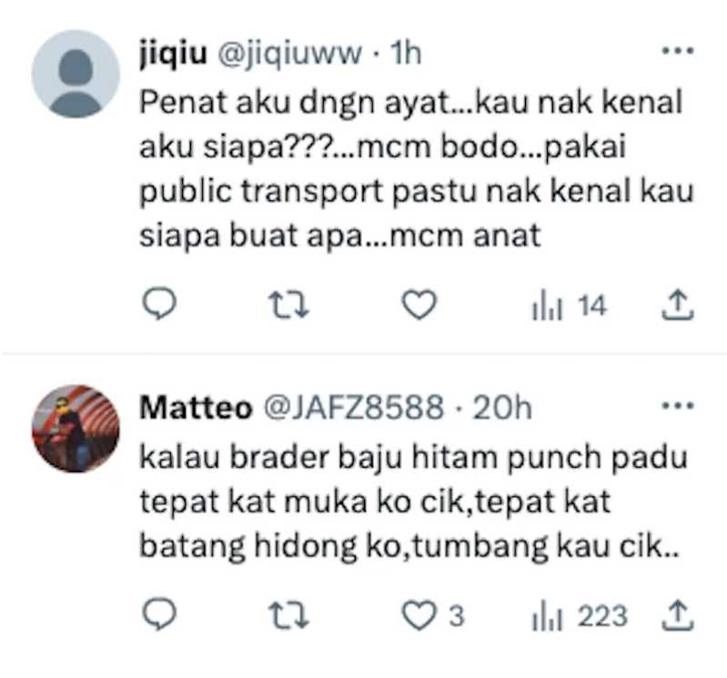 Mereka juga turut memuji kesabaran penumpang lelaki yang memakai baju warna hitam kerana tidak bertindak kasar.
