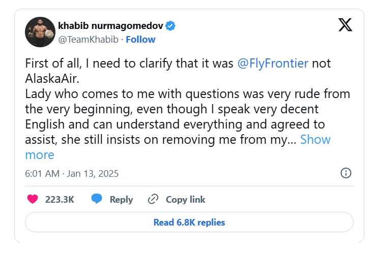 Menerusi akaun X miliknya, Khabib menjelaskan semasa proses daftar masuk, beliau ditanya jika beliau memahami bahasa Inggeris dan beliau mengesahkan kepada kakitangan syarikat penerbangan tersebut dia tiada masalah memahami bahasa itu.