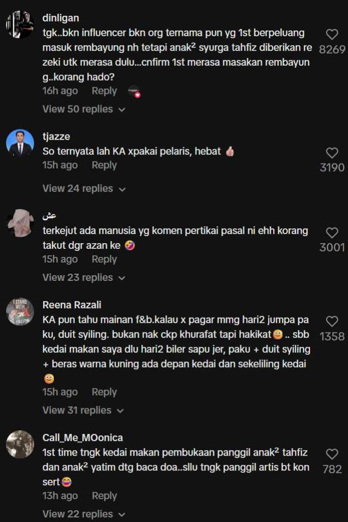 Satu lagi komen yang meraih ribuan tanda suka menyebut, “Tengok… bukan influencer, bukan orang ternama pun yang first berpeluang masuk Rembayung ni tetapi anak-anak syurga tahfiz… confirm first merasa masakan Rembayung korang hado?”
