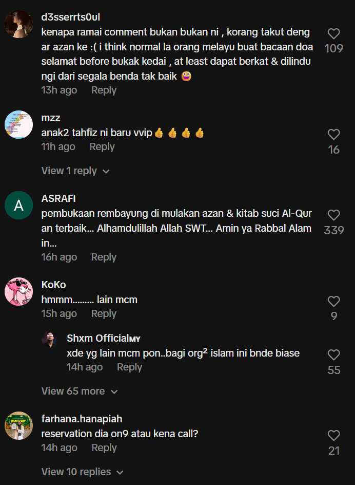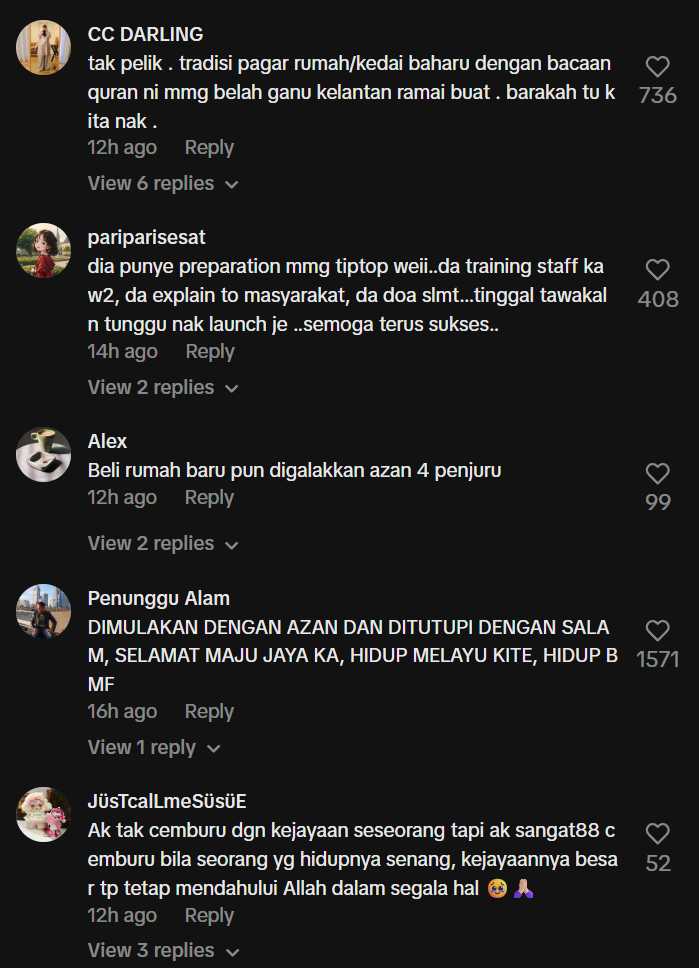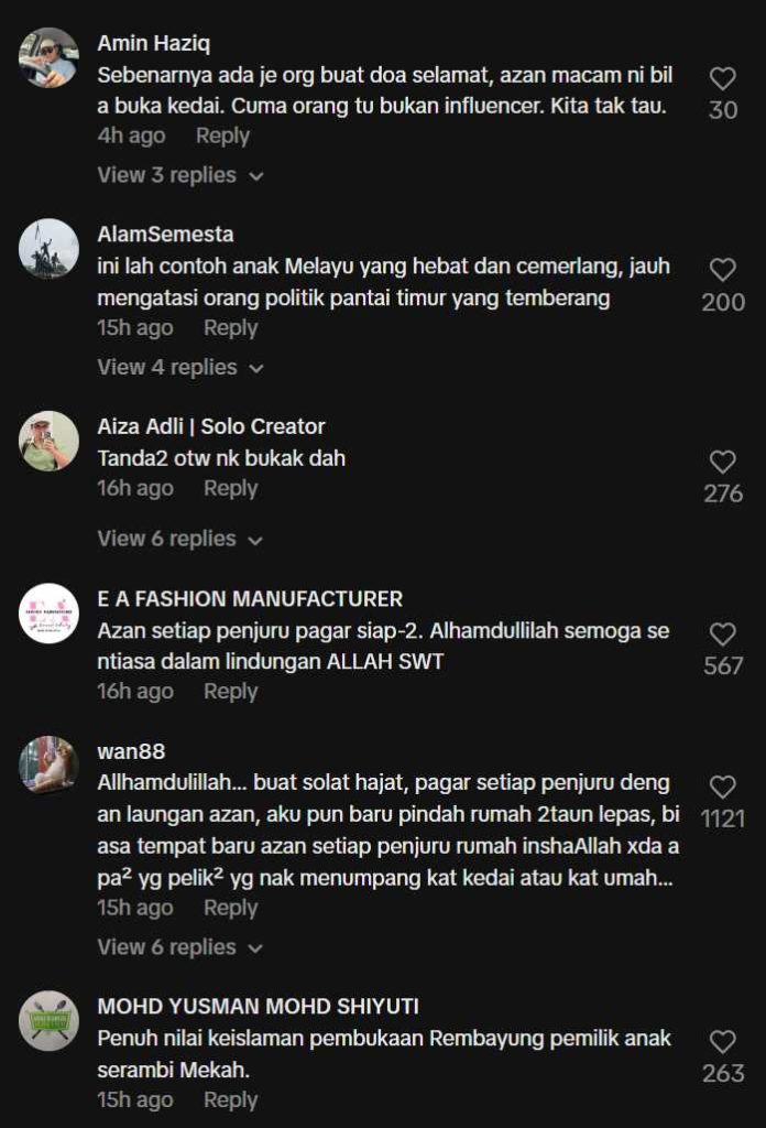 • “Kenapa ramai komen bukan-bukan, korang takut dengar azan ke? Normal la orang Melayu buat bacaan doa selamat before buka kedai, at least dapat berkat & dilindungi,” tulis seorang pengguna yang tidak setuju dengan kritikan tersebut.