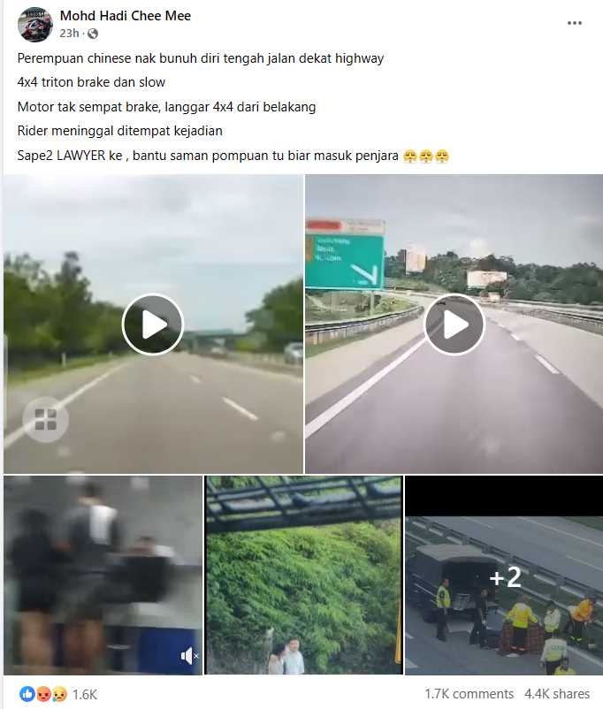 Jap! Kenapa dia nak lintas jalan? Masalahnya, siap ada perempuan lain backup kata penunggang tu yang salah sebab bawa laju. Apekejadah!