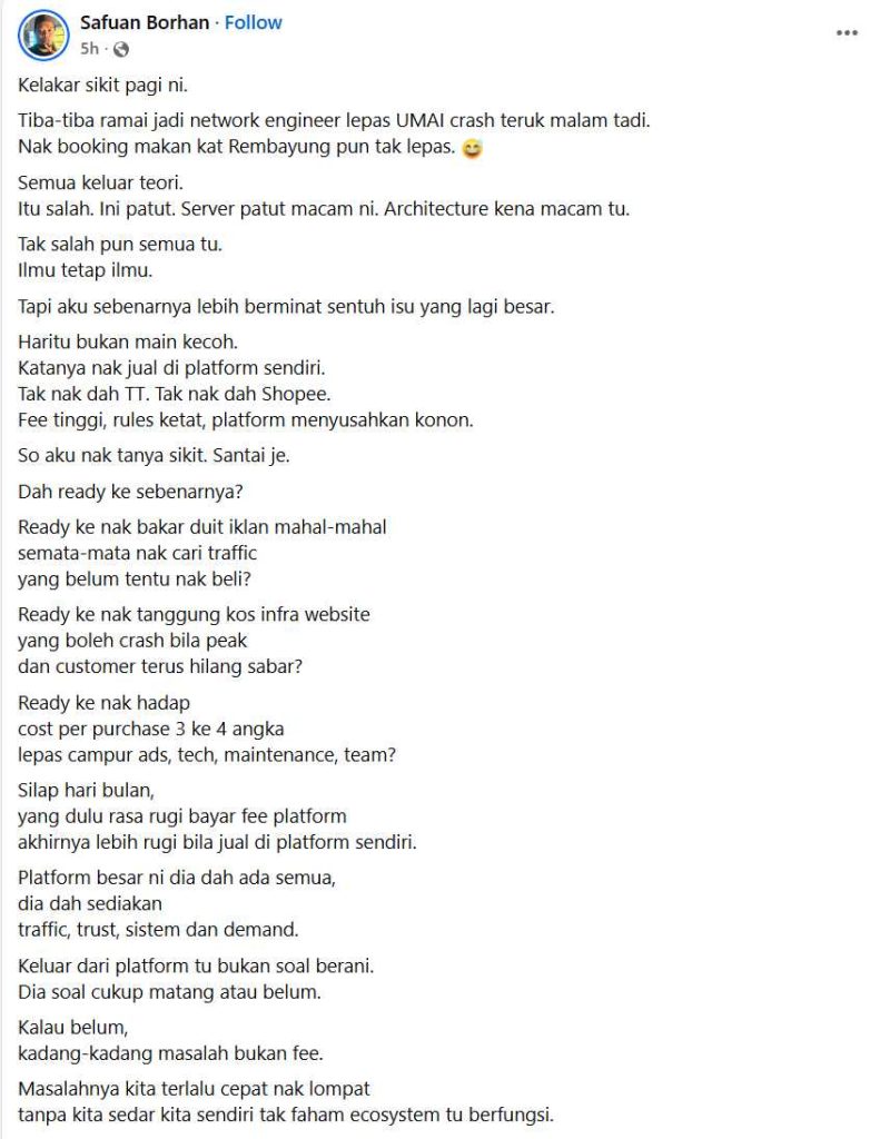 • Seorang pengamal pemasaran digital, Safuan Borhan, menulis panjang di Facebook mengingatkan pengusaha supaya menilai semula kesediaan jika mahu keluar daripada ekosistem seperti Shopee, Foodpanda atau platform besar yang sudah sedia mempunyai trafik, trust dan sistem stabil.